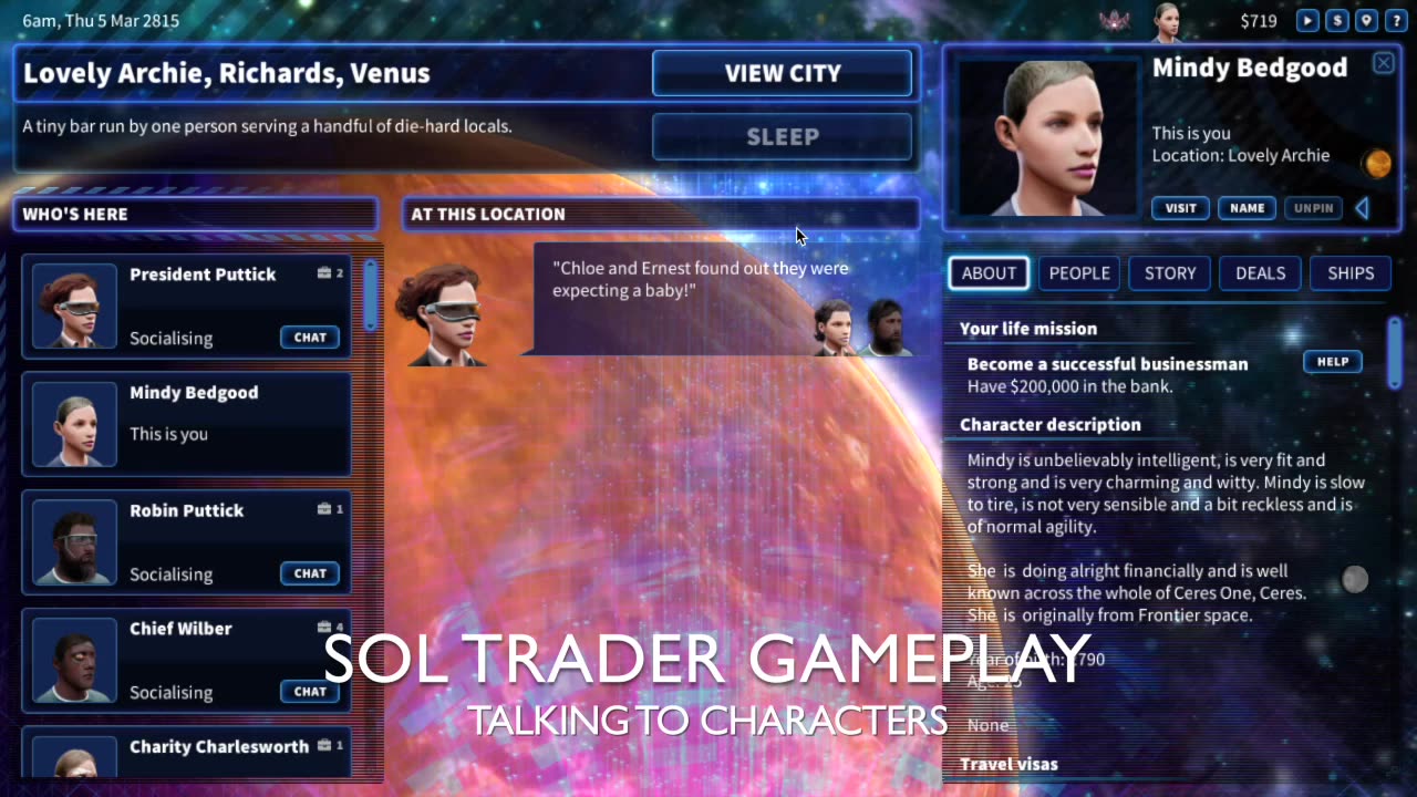 Em Sol Trader, não há um navio fornecido inicialmente; no entanto, é possível pegar empréstimos ou procurar parentes ricos para obter o primeiro veículo espacial. A história se desenrola conforme você navega entre planetas e interage com uma população de milhares de personagens únicos que têm suas próprias vidas, ambições e desafios. Converse com amigos e parentes para coletar informações sobre outros jogadores ou figuras influentes.